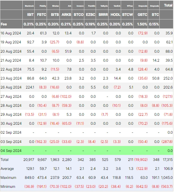 Ifølge data fra Farside Investors opplevde de 11 ETF-ene et samlet netto utstrømning på 287,8 millioner dollar, det største dagsbeløpet siden 1. mai, da fondene mistet nesten 500 millioner dollar.
