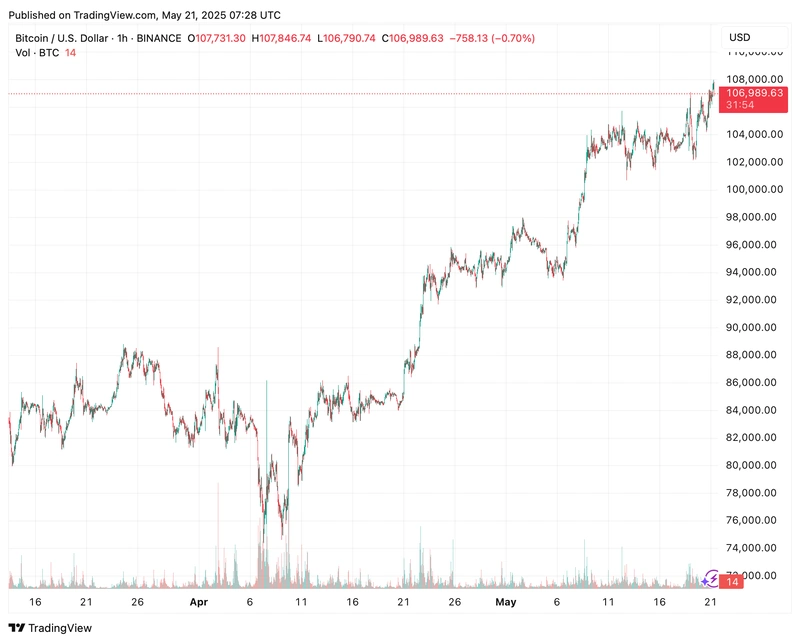 Bitcoin steg nylig til en ny høyde på rundt 108 000 dollar per 21. mai 2025, noe som markerer et viktig øyeblikk i den pågående oppgangen. I motsetning til skarpe, uforutsigbare topper, gjenspeiler denne økningen en velorganisert og jevn oppadgående bevegelse drevet av ekte markedsstyrke.