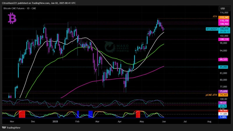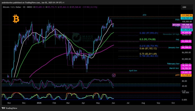 Det er verdt å merke seg at Bulls foretrekker en mildere tilbaketrekning tidlig i måneden fremfor senere, for å potensielt kunne avslutte juni i pluss. Så lenge Bitcoin handles over april-lavpunktet på 74,4k, er den fortsatt innenfor Higher Low-territoriet og kan «tåle» en dypere tilbaketrekning. Ideelt sett forsvarer Bitcoin og Bulls 100k-sonen og søker støtte i den øvre 90k-regionen og den daglige 55EMA 99,8k, hvorfra det potensielt kan utløse en positiv reaksjon og fortsettelse av den bredere trenden. 🌈 ⬆️ 🚀