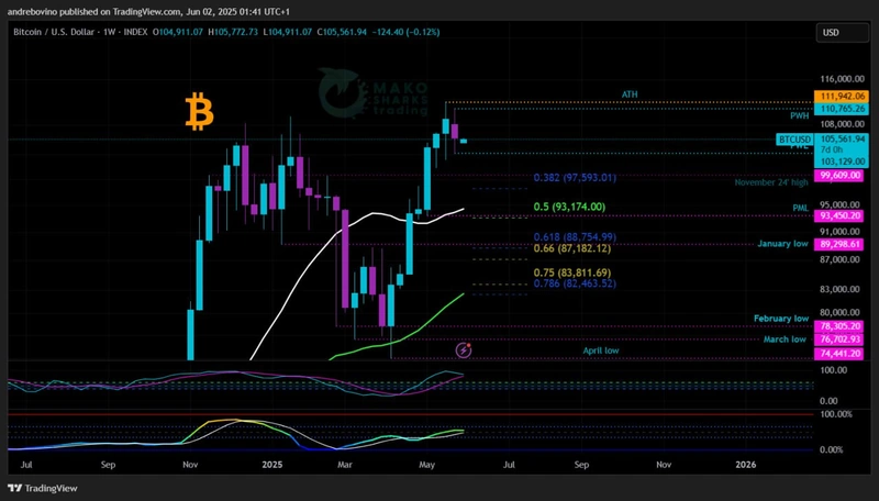 Bitcoin starter den nye uken på 105,6k og navigerer mellom viktige soner mens Bulls og Bears kjemper om kontrollen på kort sikt. Etter en mild tilbakegang fra den nylige ATH, trenger Bulls en daglig sluttkurs over PWH 110,7k for å gjenvinne momentum, mens Bears sikter mot et fall under 100k for å utløse en utvidet korreksjon. Begge sider er nær viktige vendepunkter, noe som gjør dette til en potensielt avgjørende uke. Vil Bulls gjenvinne dominansen, eller vil Bears bremse opp og dempe Hopium? 🐂 🥊 🐻