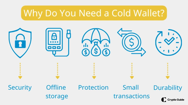 Kald lommebok er avgjørende for alle som tar beskyttelsen av kryptovaluta på alvor. De oppbevarer private nøkler offline og beskytter mot hackere, skadelig programvare og andre trusler på nettet. Kald lommebok gir ekstra sikkerhet, enten du velger en maskinvarelommebok, kjent for sin holdbarhet og brukervennlighet, eller en papirlommebok på grunn av sin enkelhet og lave pris. For mer informasjon, sjekk ut vår guide til de beste kryptovaluta-lommebøkene og de beste kalde lommebøkene.