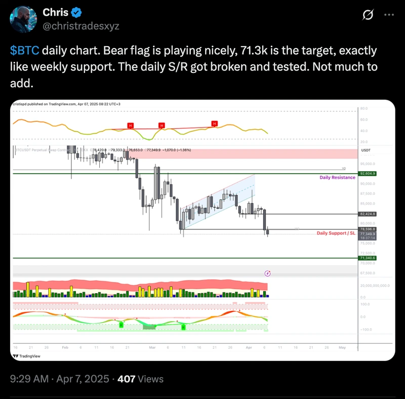 Bitcoin (BTC), som for tiden er priset til $ 79,153, falt nylig til et fire måneders lavpunkt på $ 74,500 7. april, og det er bekymring for at prisen fortsatt kan falle ytterligere.