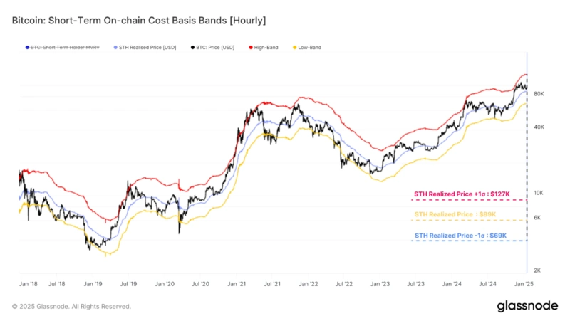 Glassnodes Short-Term Holder (STH) realiserte prisbånd antyder at det gjennomsnittlige kostnadsbasen for kortsiktige innehavere er rundt $ 89,000. Historisk sett har $ 69,000 69,000-området fungert som en «maks smerte» -sone der kortsiktige investorer har en tendens til å kapitulere under tilbaketrekninger i markedet, noe som ofte fører til at langsiktige investorer går inn og gir støtte.