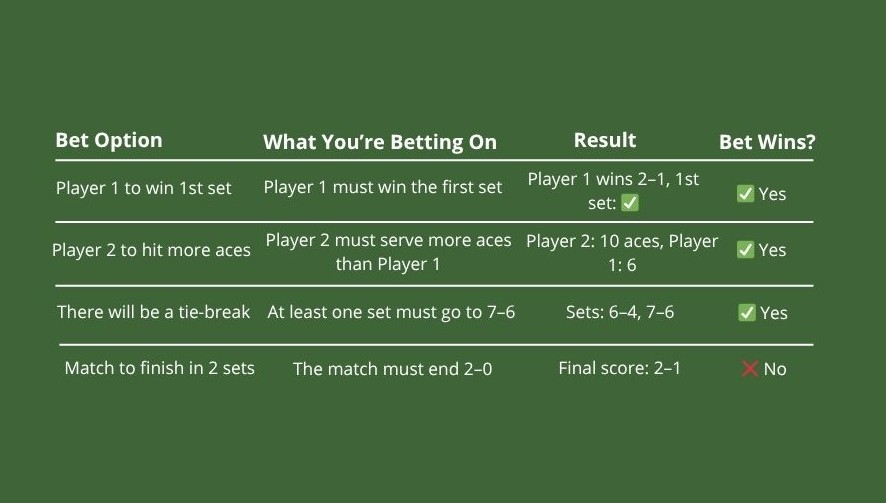 - Understand how each tennis bet type works — rules differ for match betting, set betting, handicaps, and prop bets.