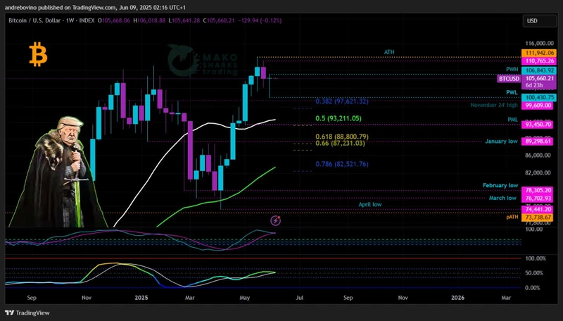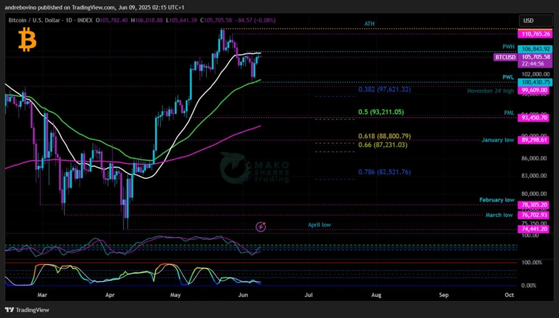 For Bulls og Hopium er to ting avgjørende! Unngå enhver daglig sluttkurs i løpet av uken under den daglige 55EMA på 101k og PWL på 100,4k, og sikre enhver vellykket daglig sluttkurs over PWH på 106,8k og den daglige 21SMA på 106,6! Hvis Bitcoin lykkes med å gjenvinne 106k-sonen og den daglige 21SMA som støtte igjen, åpner det døren for et forsøk på å utfordre den nåværende ATH og et potensielt gjennombrudd til nytt ukjent territorium.