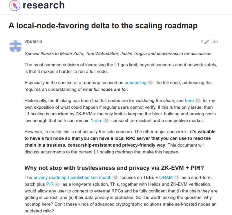 Det er utfordrende å kjøre en full Ethereum-node fordi det krever lagring av en stadig voksende mengde data. Etter hvert som Ethereum skaleres og håndterer flere transaksjoner, blir det mer krevende å vedlikeholde fullstendige noder, noe som potensielt kan sette nettverkets desentralisering i fare. For tiden er mange brukere avhengige av tredjeparts RPC-tjenester for å få tilgang til Ethereum-data, noe som reiser bekymringer om tillit, sensur og personvern. Vitalik ønsker å løse disse problemene ved å tenke nytt om hvordan noder fungerer.